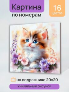 Холст с красками 20х20 см по номерам (в коробке) (16 цв.) Котёнок в цветах (арт.Х-0740)