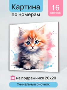 Холст с красками 20х20 см по номерам (в коробке) (16 цв.) Красочный пушистый котёнок (арт.Х-0733)