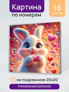 Холст с красками 20х20 см по номерам (в коробке) (16 цв.) Пушистый заяц с сердечком (арт.Х-0750)
