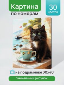 Холст с красками 30×40 см по номерам (в коробке) (30 цв.) Чёрный котик с чашкой (арт.ХК-3229)
