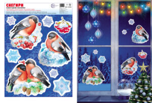 Новогодние наклейки на окна НМТ1-15346 А4+ Снегири в кормушке видны с обеих сторон многоразовые А4+