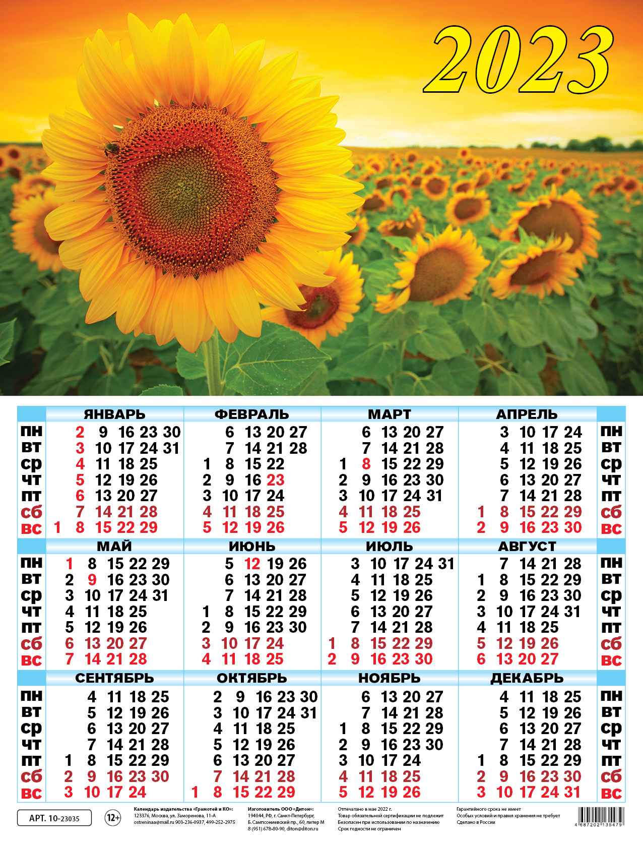 Календарь-плакат 2023 А2 Подсолнухи /КРАТНО 5ШТ/10-23035