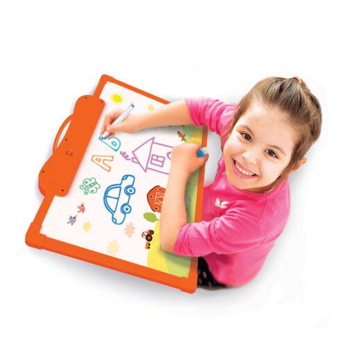 Вторая сторона называется «Пиши, рисуй, стирай». На ней можно рисовать цветными фломастерами, писать цифры и буквы, а потом стирать и рисовать снова. Фломастер со стирающим колпачком уже в комплекте!