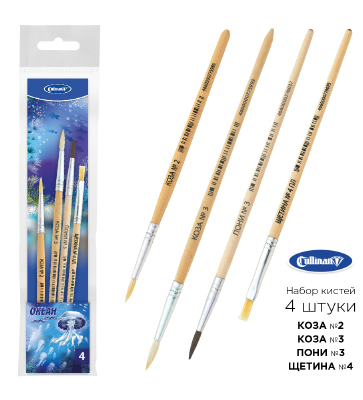 Кисть 4шт Набор щетина плоск №4, коза №2, №3, пони №3 «Океан» европодвес FB-02/4 OC 6587