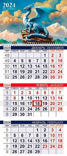 Календарь кварт 2024 3-х блоч на гребне 298х690мм -Год ледяного дракона- Бумага Офсет 2-х цв. блок с бегунком 19423