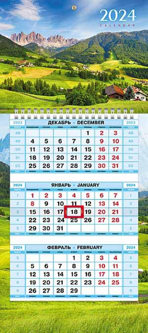 Календарь кварт 2024 3-х блоч на гребне 195х440мм -Горные долины- бум. мелован. цветной блок с бегунком 29774