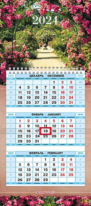 Календарь кварт 2024 3-х блоч на гребне 195х440мм -Цветущая аллея- бум. мелован. цветной блок с бегунком 29818