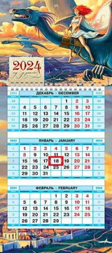 Календарь кварт 2024 3-х блоч на гребне 195х440мм -Год сказочного дракона- бум. мелован. цветной блок с бегунком 26754