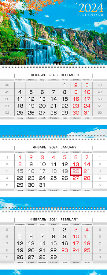 Настенный квартальный календарь 3-х блочный на 3-х гребнях. Полный формат: 297х758 мм, формат постера: 297х180 мм. Постер и подложка: полноцветная печать, мелованный картон 250 гр. Блок: 297х165 мм, 2-х красочная черно-красная печать, офсет, курсор-бегунок. Крепление: металлическое пикколо. Упаковка: индивидуальная в пакет с европодвесом. Практичный и эстетичный календарь будет радовать целый год. Элегантная черно-красная сетка отлично гармонирует с ярким полноцветным постером. Календари ТМ Hatber российского производства отпечатаны на современном высокотехнологичном оборудовании и соответствуют стандартам качества.