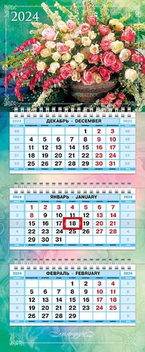 Календарь кварт 2024 3-х блоч на 3-х гребнях 195х470мм -Роскошный букет- бум. мелован. цветной блок с бегунком 11493