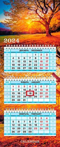 Календарь кварт 2024 3-х блоч на 3-х гребнях 195х470мм -Медовый закат- бум. мелован. цветной блок с бегунком 14485