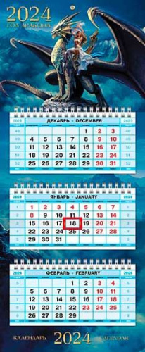 Календарь кварт 2024 3-х блоч на 3-х гребнях 195х470мм -Год Дракона- бум. мелован. цв блок с бегунком 29882