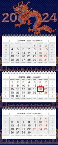 Календарь кварт 2024 3-х блоч на 3-х гребнях 320х790мм -Год дракона- бум. мелован. 2-х цв. блок с бегунком мат.ламин. 3D фольга 29911