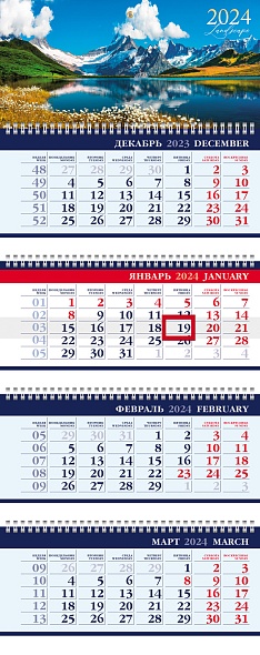Календарь кварт 2024 4-х блоч на 4-х гребнях 297х755мм -Озеро в горах- Бумага Офсет с бегунком 2-х цв. блок 29712