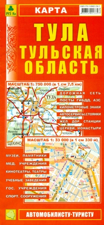 Двусторонняя полноцветная карта. Содержит подробный план города со всеми улицами, номерами угловых домов. Указано расположение административных зданий и социально-культурных объектов. Имеется указатель улиц. Масштаб г. Тулы 1:33 000. Подробная карта области с указанием класса дорог и расстояний между населенными пунктами в километрах. Указано расположение постов ГИБДД, автозаправочных станций, гостиниц и домов отдыха. Имеется указатель населенных пунктов. Масштаб 1:750 000. Формат в разложенном виде 495 х 695 мм.