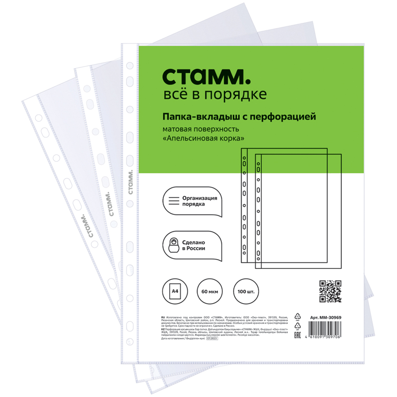 Папка-вкладыш с перфорацией «СТАММ» отлично подойдет хранения и систематизации документов. Папка размером 305*235 мм изготовлена из полипропилена толщиной 60 мкм. Папка вмещает до 50 листов. Имеет текстуру «апельсиновая корка», защищает листы от внешних воздействий. Перфорация на боковой части позволяет разместить изделие в папке с любым кольцевым механизмом или скоросшивателе. Упакованы в пакет по 100 штук.