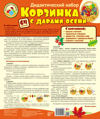 Занятия и игры с данным комплектом разовьют у детей эстетический вкус, речевые способности, крупную и мелкую моторику, сформируют элементарные математические представления. Помимо этого, корзинка может служить украшением помещения и использоваться на тематических вечерах, викторинах или праздниках, посвященных осени.