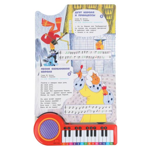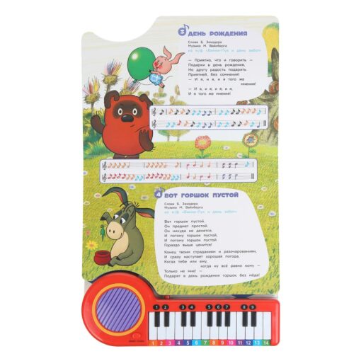 На каждой страничке это занимательной книги ребёнка ждут красивые иллюстрации, тексты песенок и ноты к ним. При нажатии на кнопку слева от клавиш происходит переключение на режим проигрывания песен, при втором нажатии — переключение на пианино. В режиме пианино маленький музыкант, нажимая на клавиши, сможет наиграть по нотам-подсказкам песенки из книги или придумать свои собственные мелодии. Книга сделана из плотного картона, поэтому мамы могут не опасаться, что ребёнок порвёт странички.