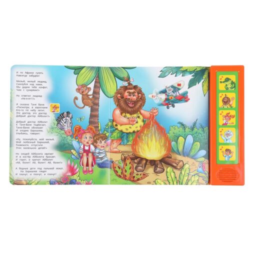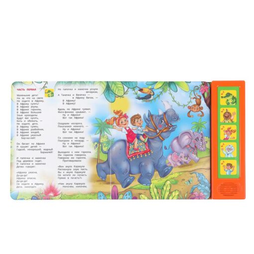 Ребёнок с удовольствием будет листать плотные страницы, рассматривать яркие картинки, нажимать на кнопки и слушать известную стихотворную сказку Корнея Чуковского. Малыш легко освоит включение звука: по нажатию на кнопку звук включится, при втором нажатии выключится. Благодаря компактному размеру книгу удобно брать с собой в дорогу.