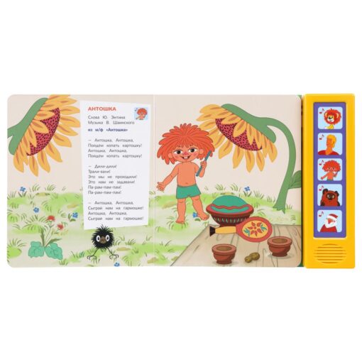 Ребёнок с удовольствием будет листать плотные страницы, рассматривать яркие картинки и, конечно, нажимать на кнопку и слушать весёлые песенки из любимых м/ф. Ребёнок легко освоит включение звука: по нажатию на кнопку звук включится, при втором нажатии выключится. Книжка сделана из плотного картона, поэтому родители могут не опасаться за её сохранность. Благодаря компактному формату её удобно брать с собой.