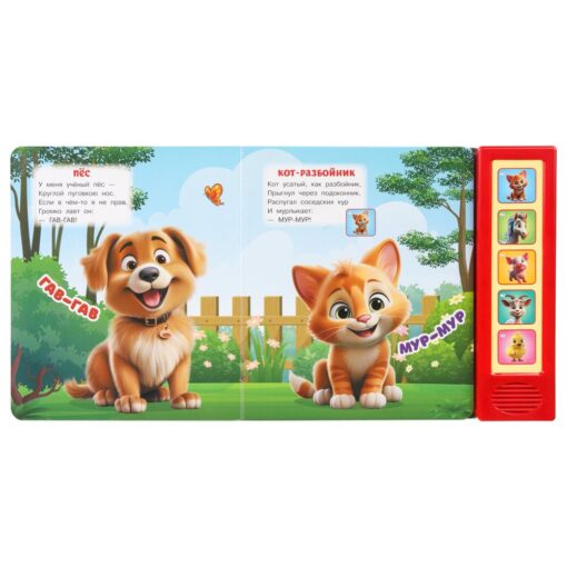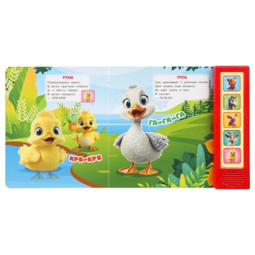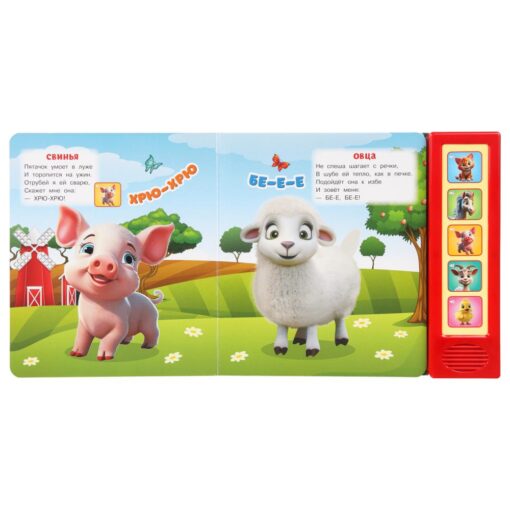 Красочная музыкальная книга познакомит малыша с животными, которые живут на ферме. А песенки сделают чтение ещё более увлекательным. Ребёнок легко освоит включение звука: по нажатию на кнопку звук включится, при втором нажатии выключится. Книжка сделана из плотного картона, поэтому родители могут не опасаться за её сохранность. Благодаря компактному формату её удобно брать с собой.