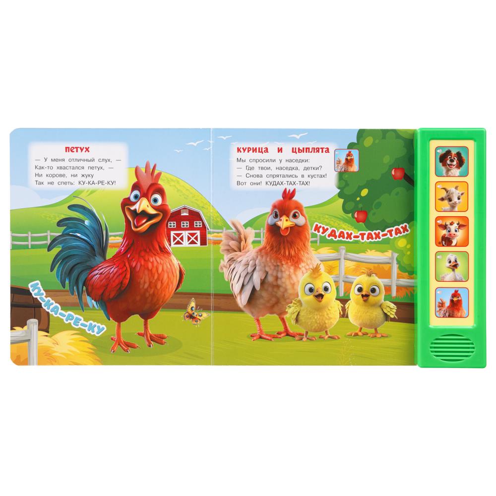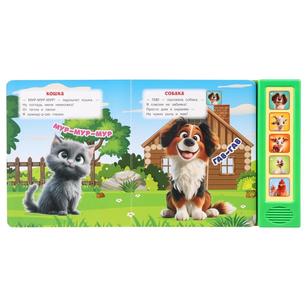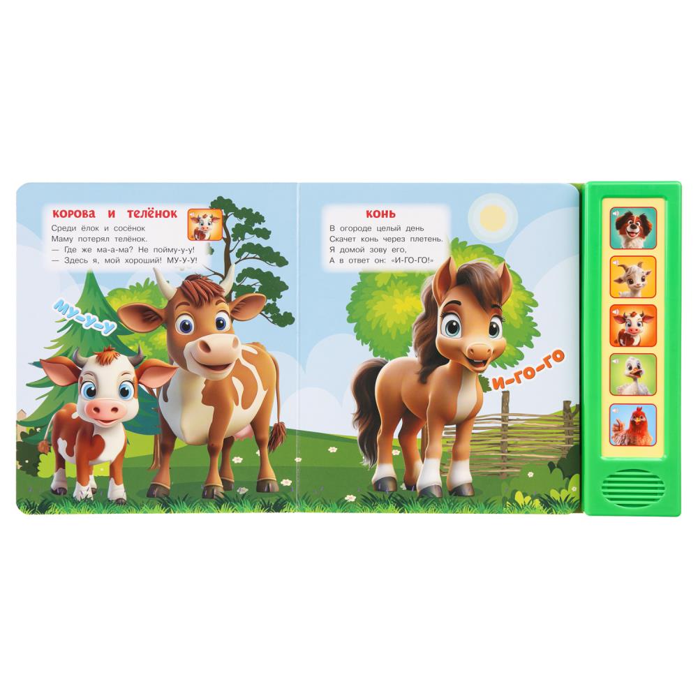 Красочная музыкальная книга познакомит малыша с домашними животными. А песенки сделают чтение ещё более увлекательным. Ребёнок легко освоит включение звука: по нажатию на кнопку звук включится, при втором нажатии выключится. Книжка сделана из плотного картона, поэтому родители могут не опасаться за её сохранность. Благодаря компактному формату её удобно брать с собой.