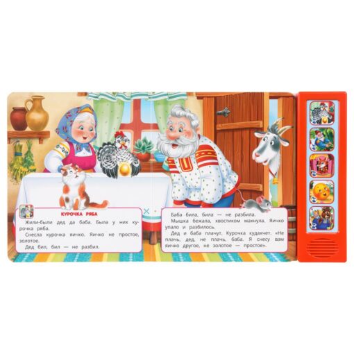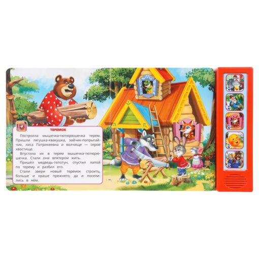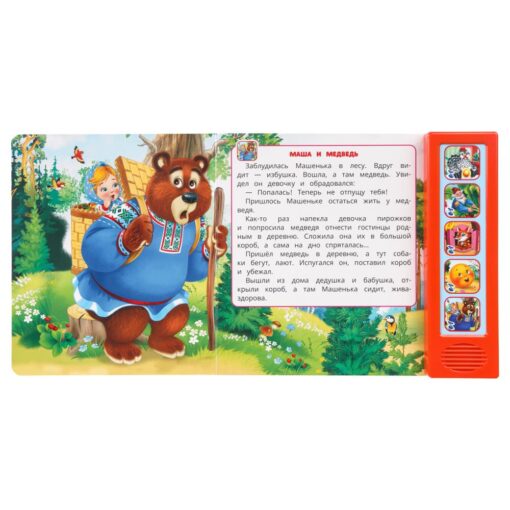 Малыш будет с удовольствием рассматривать яркие страницы, читать вместе с родителями поучительные истории и слушать мелодичные песенки по мотивам сказок. На каждой кнопке записано по 4 песни. Книжка сделана из плотного картона, поэтому родители могут не опасаться за её сохранность. Благодаря компактному формату издание удобно брать с собой.