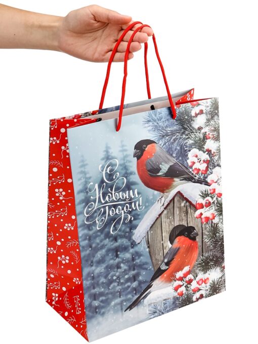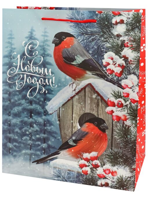Пакет подарочный с мат.лам. и глит. 26х32х10 см (L) Снегири, 190г ППК-2339