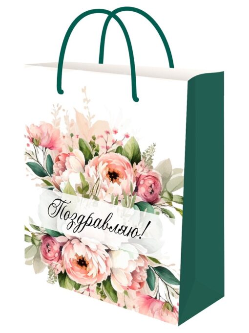 Пакет подарочный с мат.лам. и глит. 18х23х10 см (M) Пионы, 190г(собс.раз.) ППК-2751