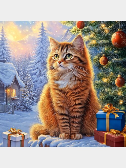 Алмазная мозаика (класс.) 20х20 см c подр., с полн. заполн. (24цв) Пушистый кот у ёлки арт. НД-0452