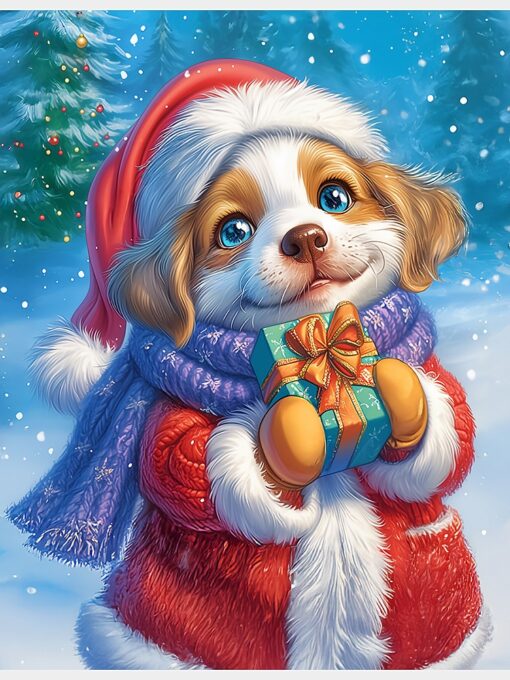 Холст с красками 17х22 см по номерам в коробке (14цв.) Щенок в костюме Деда Мороза арт. ХК-0491