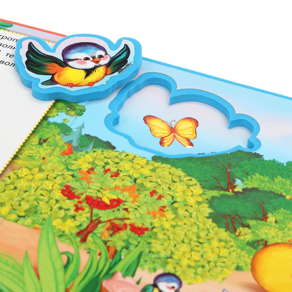 Оригинально оформленная книжка с фигурной вырубкой, яркими страницами и мягким обрамлением обязательно заинтересует маленького любознайку. Ребёнок с удовольствием будет листать книгу с помощью специальных закладок и играть с 5 пазлами-вставками, извлекая их из страниц и помещая обратно. Благодаря компактному формату книжку удобно брать с собой в дорогу.
