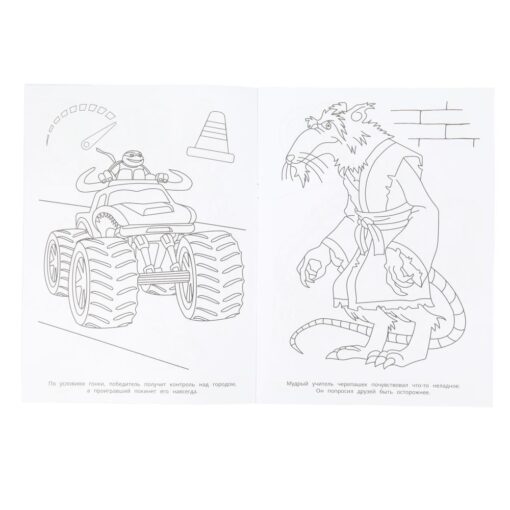 Эта увлекательная раскраска про гонки черепашек-супергероев на крутых машинах непременно понравится вашему ребёнку. В ней он найдёт интересные картинки с чёткими контурами и сюжетными текстами к ним. Данное издание станет отличным вариантом, чтобы взять его с собой в путешествие и скоротать время в дороге за раскрашиванием.