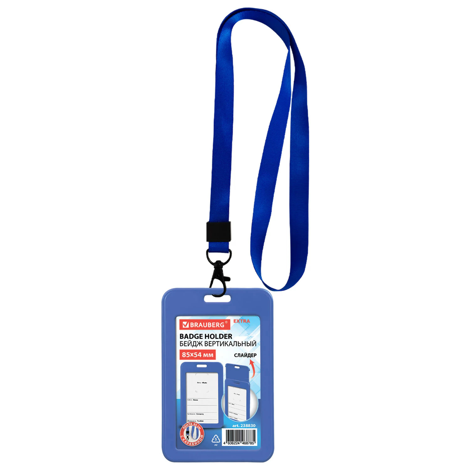 Бейдж вертикальный 85х54 мм лента 45см с карабином Слайдер синий BRAUBERG EXTRA 238830