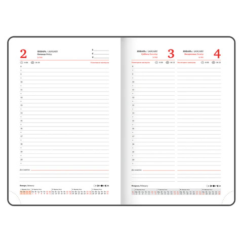 Внутренний блок включает 168 листов белой бумаги плотностью 70 г/м2. Каждая страничка имеет перфорированный угол. Благодаря стандартному формату А5 (138х213 мм) датированный ежедневник удобно использовать как в офисе, так и на выездных деловых встречах.