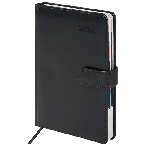 Внутренний блок включает 168 листов белой бумаги плотностью 70 г/м2. Каждая страничка имеет перфорированный угол. Благодаря стандартному формату А5 (148х218 мм) ежедневник удобно использовать как в офисе, так и на выездных деловых встречах. Твердая обложка черного цвета прошита по периметру и стилизована под гладкую кожу. Обложка фиксируется магнитной застежкой, поэтому ежедневник не откроется в сумке или портфеле и страницы не помнутся. Материал обложки подходит для горячего тиснения.