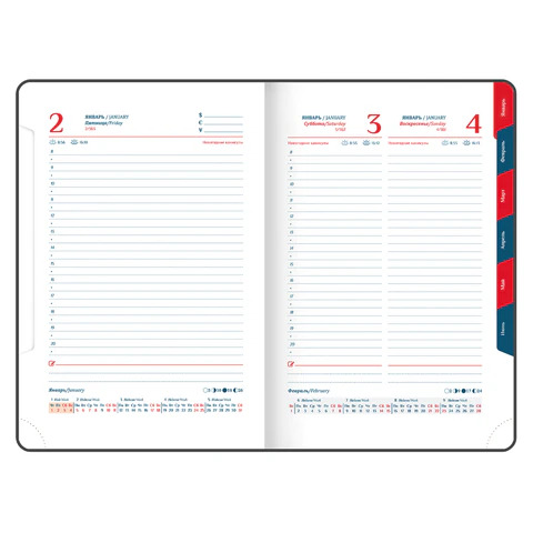 Дополнением является закладка-ляссе, с помощью которой при необходимости можно быстро открыть ежедневник на нужной странице, а также вырубка по месяцам. Ежедневник снабжен обширным справочным материалом. В конце есть 6 страниц для записей и заметок.
