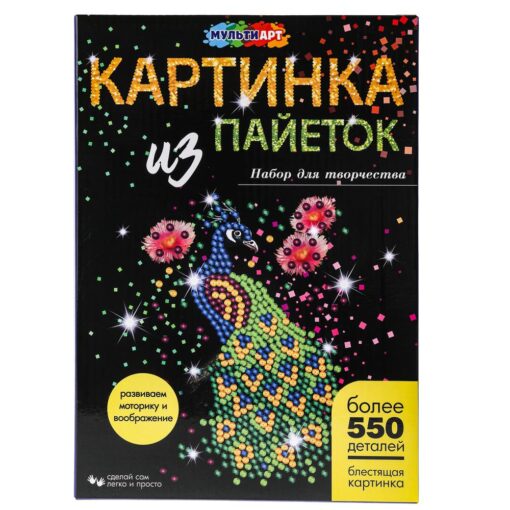 Набор для творчества — картина из пайеток с гвоздиками «Павлин» ТМ «Мульти Арт» — отличный подарок для маленького художника.