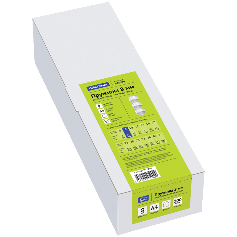 Пластиковые пружины OfficeSpace белого цвета диаметром 8мм предназначены для переплета документов. Легко выдерживают многократное раскрытие при необходимости добавить или удалить листы из готовой брошюры. Рекомендуемый объем брошюры при использовании данного диаметра пружины: 21-40 листов.
