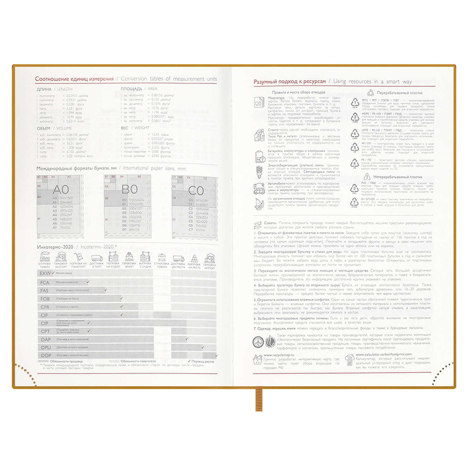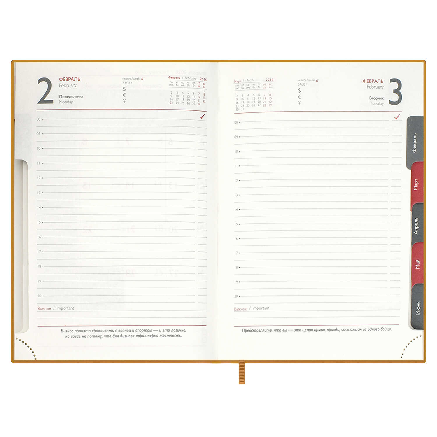 Ежедневник датированный 2026 ESCALADA, #ДУМАЙ КАК МИЛЛИАРДЕР, А6+, 176 л., арт. 70300/ 20 ТИВОЛИ ГЛОСС ГОРЧИЧНЫЙ (кожзам: 126х174 мм, мягкий переплёт, запаянный край, материал обложки: искусственная кожа «Тиволи глосс»; декор: блинтовое тиснение; способ крепления блока: ниткошвейный; вн. блок: 176 л., кремовый офсет 70 г/м², печать в две краски (линия), справочный материал: есть; перфорация углов блока: есть; закладка/-и: одно ляссе; каптал: есть; форзац: печать пантоном; особенности: в блоке использованы мотивирующие высказывания из книги «Думай как миллиардер», помогающие сформировать правильное отношение к финансам, профессиональной деятельности, своим способностям и к жизни в целом, вырубка блока по месяцам; персонализация возможна: да; индивидуальная упаковка: промостикер + ПЭТ-пакет)