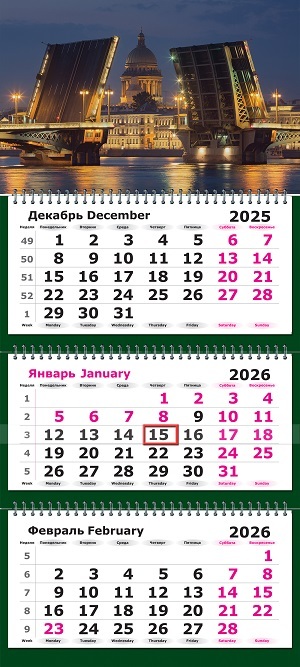 Календарь квартальный 3-х блочный 2026 Питер.Разводные мосты 305*675 13с14-90