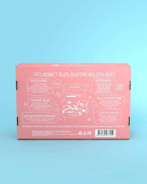 Каждая коробочка милоты наполнена необычными вещицами, которыми будет приятно пользоваться в повседневной жизни: милая канцелярия, уютные товары для дома, стильные аксессуары, предметы для здорового образа жизни и приятные мелочи. Наполнение MilotaBox стало ещё лучше! Больше подарков! Внутри каждого MilotaBox находится до 13 предметов на одну тематику, упакованных в стилизованную бумагу тишью. Коробочка из плотного, дизайнерского картона. Размер коробочки: 28,5 х 18,5 х 9,5 см. Общий вес: 900 гр.