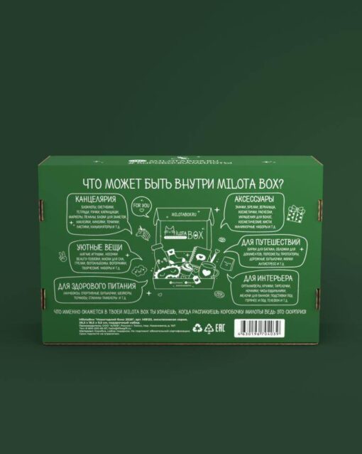 Каждая коробочка милоты наполнена необычными вещицами, которыми будет приятно пользоваться в повседневной жизни: милая канцелярия, уютные товары для дома, стильные аксессуары, предметы для здорового образа жизни и приятные мелочи. Наполнение MilotaBox находится до 12 сюрпризов, упакованных в стилизованную подарочную бумагу тишью. Коробочка из плотного, дизайнерского картона. Размер коробочки: 28,5 х 18,5 х 9,5 см. Общий вес: 700 гр.