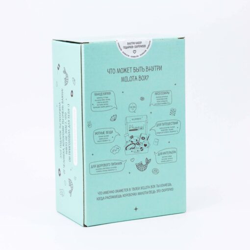 Каждая коробочка милоты наполнена необычными вещицами, которыми будет приятно пользоваться в повседневной жизни: милая канцелярия, уютные товары для дома, стильные аксессуары, предметы для здорового образа жизни и приятные мелочи. Внутри Milota BOX находится до 8 сюрпризов, упакованных в стилизованную подарочную бумагу тишью. Коробочка из плотного, дизайнерского картона. Размер коробочки: 22 х 14 х 9 см. Общий вес: 550 гр.