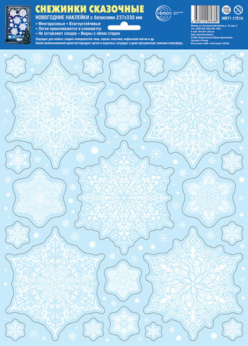 Новогодние наклейки на окна А4+. Снежинки сказочные (белила, видны с обеих сторон, многор НМТ1-17514