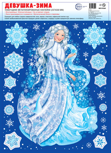 Новогодние наклейки на окна А4+. Девушка-Зима (cеребряная металлизация, многоразовые)НМТ-15340