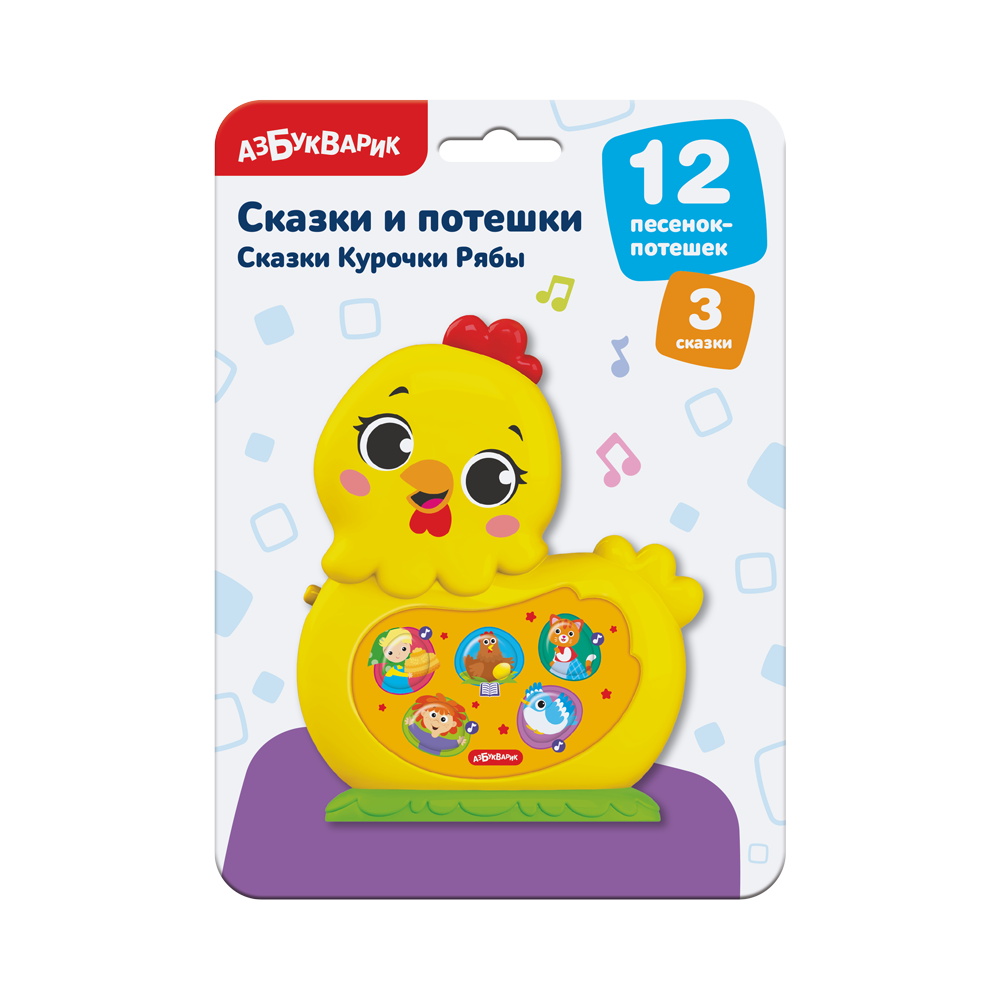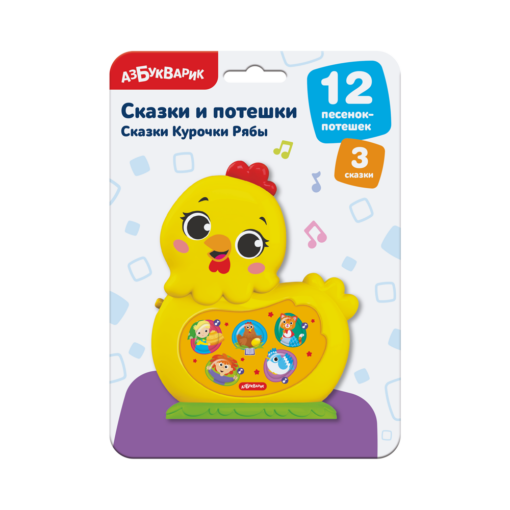 Новая серия “Сказки и потешки” познакомит ребёнка с персонажами русских народных сказок. Просто нажимайте на яркие кнопочки-картинки и музыкальная курочка Ряба споёт малышу 12 песенок-потешек («Каравай», «Заинька, попляши!», «Антошка», «Ладушки», «Чижик-пыжик» и др.) А ещё расскажет 3 любимые сказки («Курочка Ряба», «Репка», «Три поросёнка»).