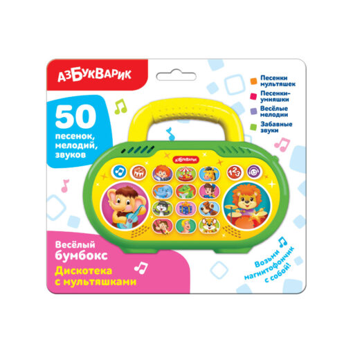 Включай Весёлый бумбокс «Дискотека с мультяшками» и слушай популярные песенки: «Антошка», «Пусть бегут неуклюже», «Весёлая карусель», «Чунга-чанга», «Арам зам зам», «По секрету всему свету», «С днём рожденья тебя!» и другие.