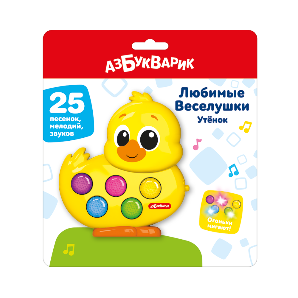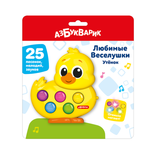 Музыкальный утёнок из серии «Любимые Веселушки» мило улыбается и замечательно поет! Нажимая на разноцветные кнопочки, малыш послушает веселые песенки и мелодии («Озорной утёнок», «Два весёлых гуся», «Если весело тебе, то делай так», «Танец маленьких утят», «Четыре таракана и сверчок», «Ах, вы, сени, мои, сени» и др.), а также множество забавных звуков и голосов зверят. Всего в игрушке 25 песенок, мелодий, звуков. Во время звучания песенок на кнопочках мигают огоньки!