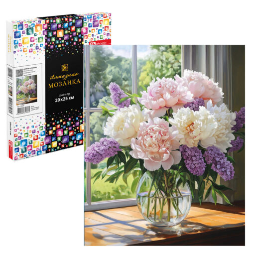 Алмазная мозаика (набор для творчества) арт. 70837 / 40 СИРЕНЬ И ПИОНЫ, размер: 20×25 см, (28 цветов страз, холст на подрамнике с напечатанной картиной, покрытый клеевым слоем и защитной пленкой, пакеты со стразами, стилус, лоток для страз, силикон для страз, клей, подвесы для подрамника, пинцет металлический, схема, дополнительные пакеты с zip-молнией, стикеры для нумерации zip-пакетов в комплекте, форма страз: квадратная, тип выкладки: полная, картонная коробка)